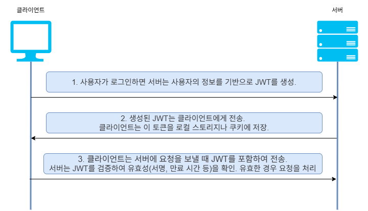 - 사용자 인증: 사용자가 로그인한 후, 서버는 사용자의 정보를 담은 JWT를 발급하여 클라이언트에게 전달함. 이후 클라이언트는 API 호출 시 이 JWT를 포함하여 인증을 수행함.